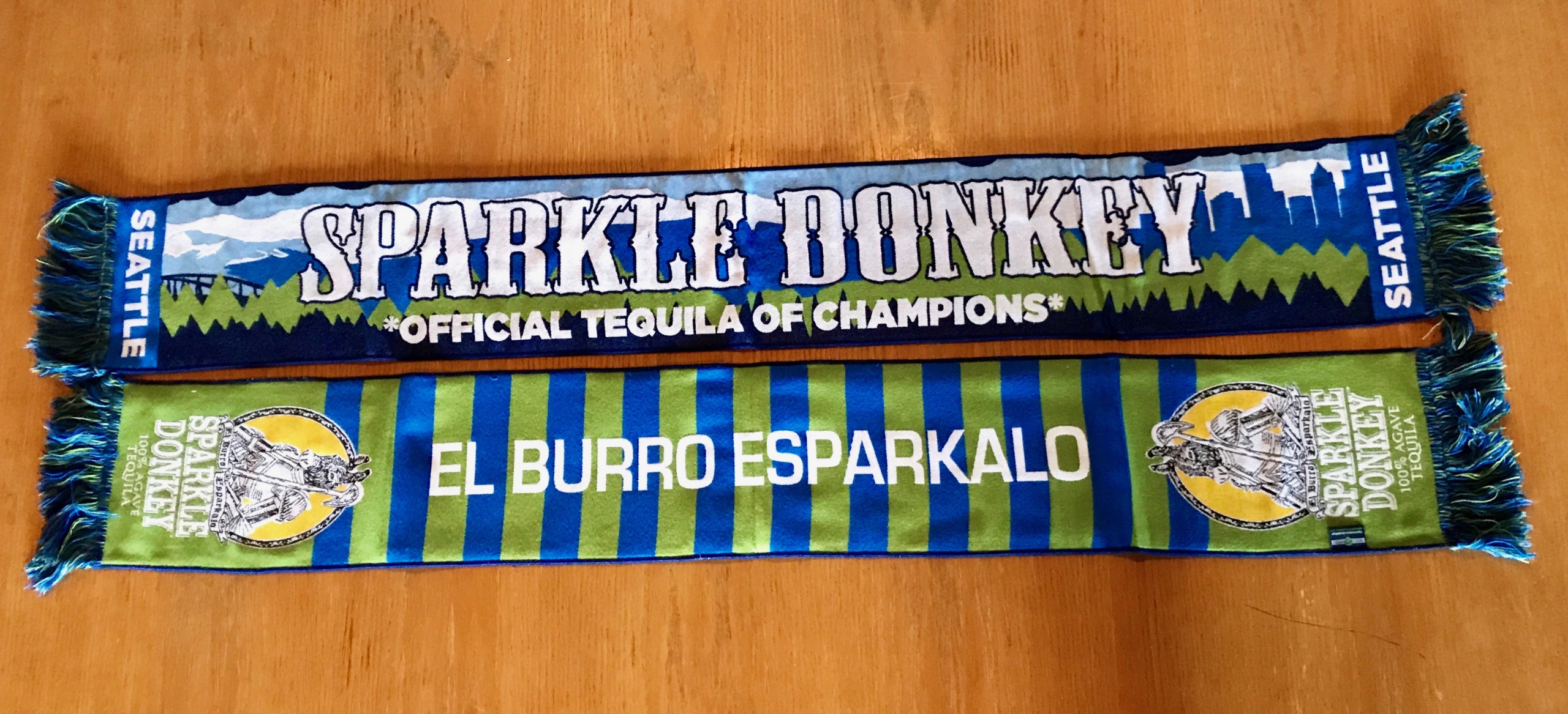 “El Burro Esparkalo” plush soccer scarf, double sided. 8” wide, 63” long.